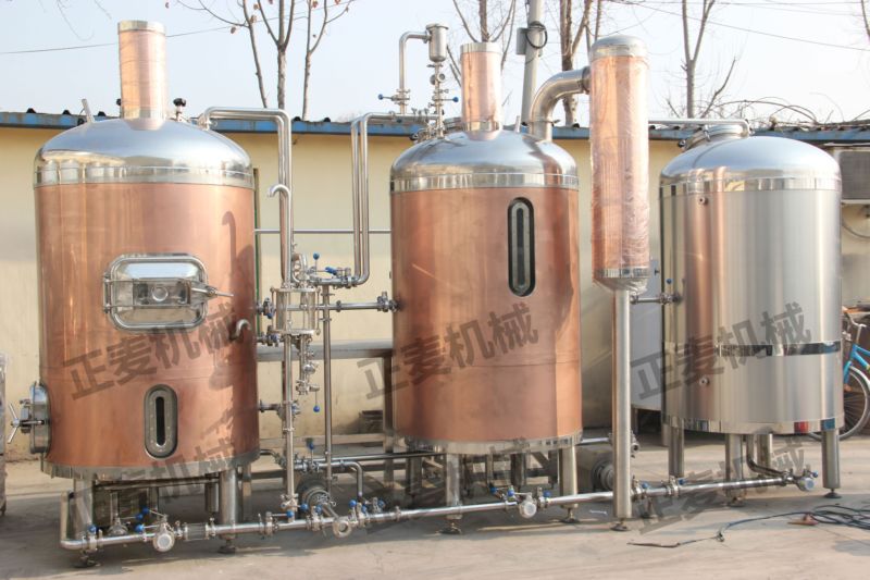 糖化系統(tǒng)是由糖化煮沸鍋、過濾槽、漩渦沉淀槽及工藝管道組成;糖化煮沸鍋為“蒸汽加熱式;電加熱式;燃?xì)饧訜崾健苯M成。罐體為雙層保溫方式“巖棉或聚氨酯”材料。加熱面積足夠達(dá)到麥汁煮沸蒸發(fā)量,能夠有效阻止熱能耗的外泄。罐體內(nèi)部采用國際標(biāo)準(zhǔn)不銹鋼精加工而成;外部采用不銹鋼或紫銅鏡面板組成,古樸典雅的外觀造型;即釀出美妙佳釀還有藝術(shù)品的象征。糖化煮沸鍋頂部加裝攪拌系統(tǒng)能使醪液均勻糖化;過濾槽頂部加裝耕刀系統(tǒng)保證醪液勻速過濾避免氧化。漩渦沉淀系統(tǒng);采用切線及離心力的作用能夠徹底的分離出多余的蛋白質(zhì)及雜質(zhì),達(dá)到成熟麥汁的純凈度。