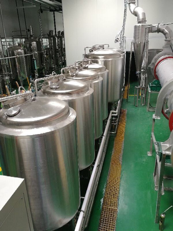 啤酒發(fā)酵系統(tǒng)有發(fā)酵罐、清酒罐、暫存罐組成;發(fā)酵是啤酒生產(chǎn)中極其重要的工藝過程。是一個有酵母參與的復雜的生化反應過程,發(fā)酵罐為錐底圓柱形,罐體具備自身冷卻裝置,可很容易地控制發(fā)酵溫度;罐底為錐形,回收酵母及清洗都很方便;罐體具有CIP清洗系統(tǒng),保證了生產(chǎn)中的衛(wèi)生安全。具備了先進的國際發(fā)酵工程技術(shù),可采用PLC自動控溫技術(shù)。全過程控制啤酒發(fā)酵。